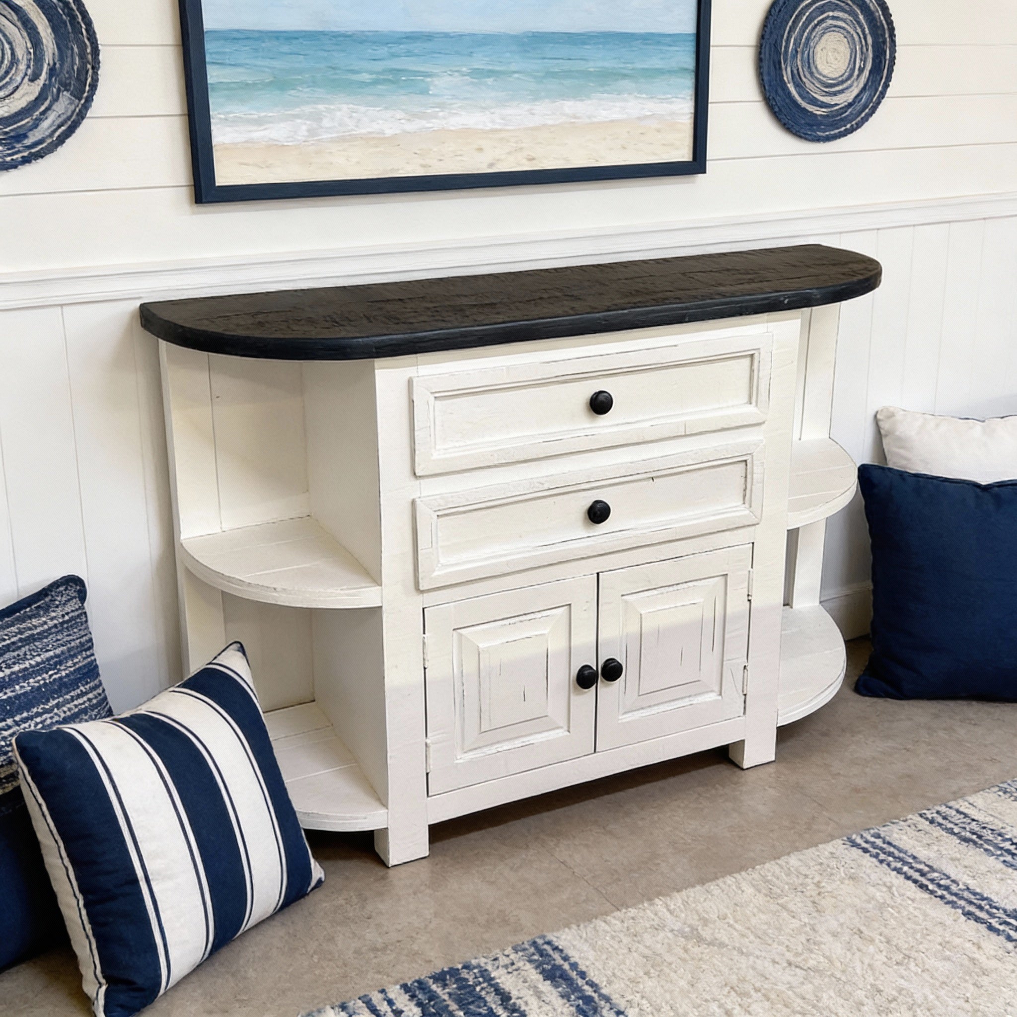 This console is part of our Coastal line. It features a beautiful two tone, white and deep ocean blue finish. Whether in the entry way or as a tv stand, this piece is the perfect addition to any home.