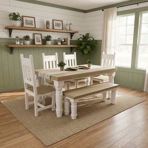 We offer a square, round, as well as 6' and 8' tables that can seat four, or six or eight or more people. Our tables and chairs are solid wood. We offer a variety of style - including rustic, ranch, traditional, weathered and suburban farmhouse, as well as Santa Fe and Southwest. Most of our tables include a bench accompanied by chairs. We hope you find what you are looking for today and we will likely have it in stock due to our large inventory.