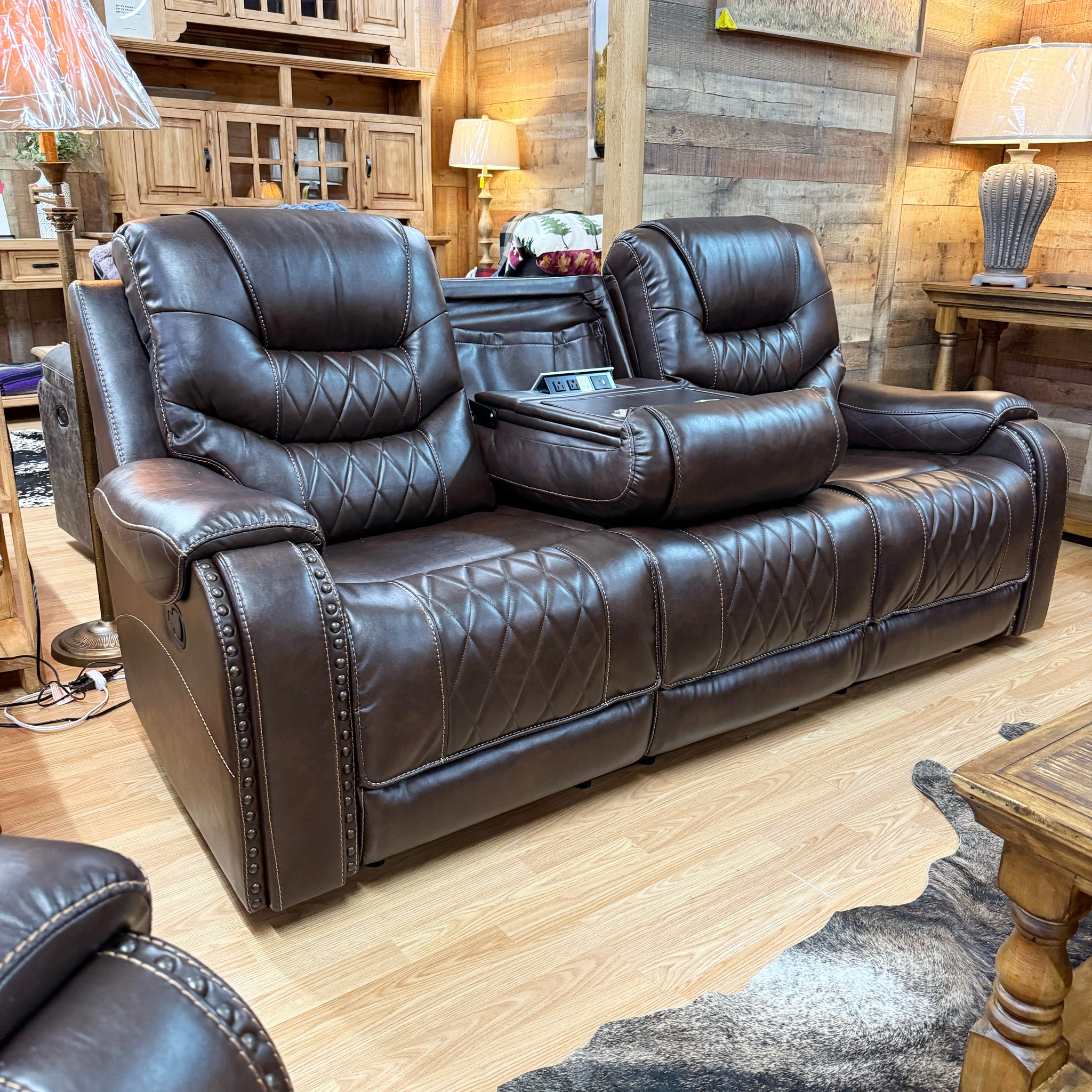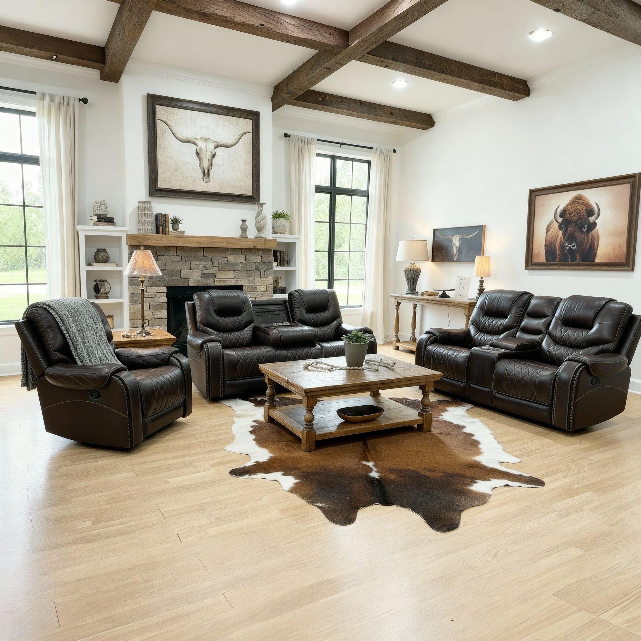 The Laredo Reclining Sofa Set exemplifies legendary rustic style with its commanding presence and authentic character. Crafted with dark chocolate leather-like fabric that is durable and liquid resistant, this sofa features distinctive saddle arms that evoke the heritage of classic Western design. This manual reclining set features a dropdown table with cup holders and charging station. Every detail reflects rustic elegance—from the rich upholstery to the thoughtfully proportioned frame—making this set an ideal centerpiece for those seeking furniture that honors tradition while delivering everyday functionality and lasting appeal.