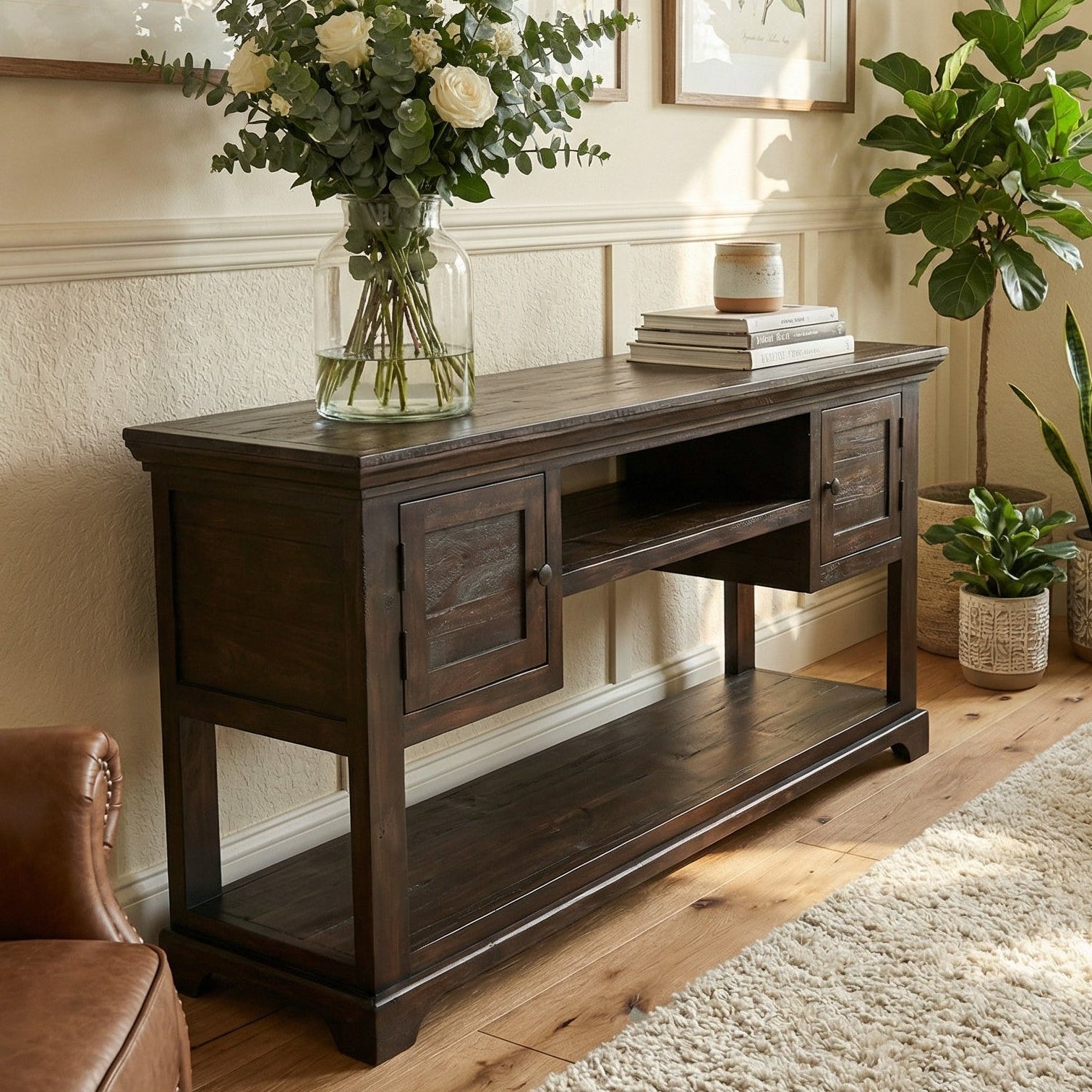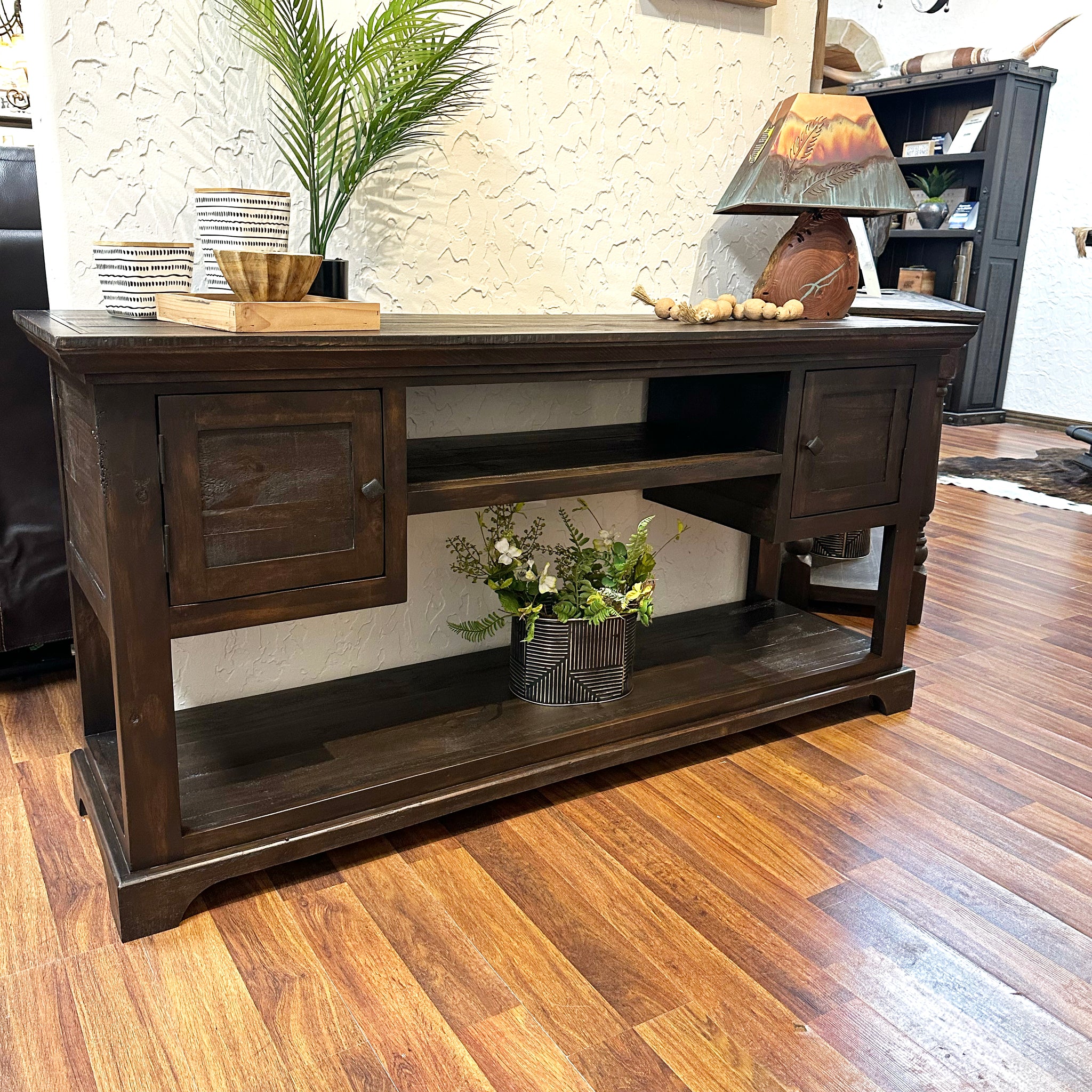 The Catalina Console boasts a timeless design and rich finish, adding sophistication to any room. With 2 doors, it offers storage space while maintaining a sleek and elegant appearance. Elevate your home decor with this classic piece.