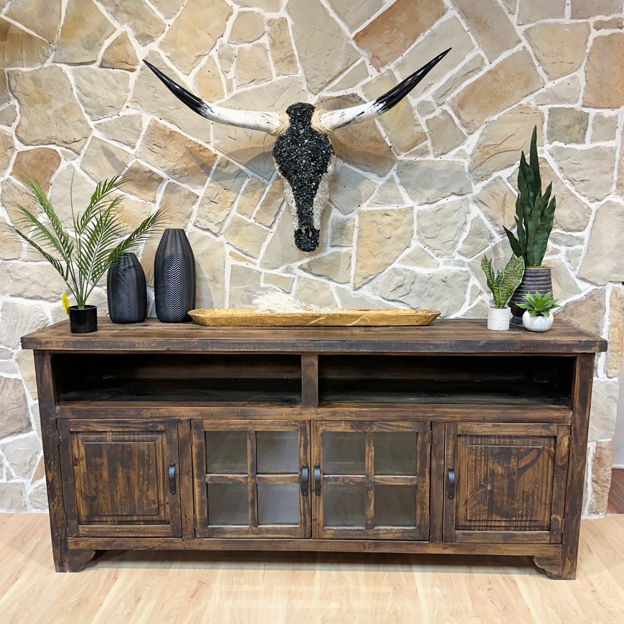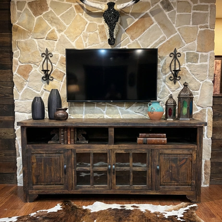 The Bonanza 80" TV Stand is finished in a Dark Wax Stain that highlights all the natural woodgrain in a charming rustic fashion. 4 doors for storage and 2 large open compartments for electronics or decor makes this a perfect Tv stand for the Family room!