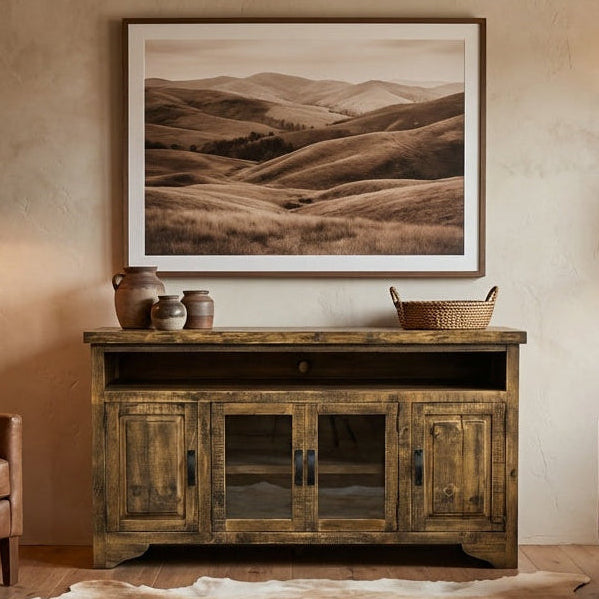 The Modern Rustic 60" TV Stand is solid wood with a timeless design. It combines the finish and character of rustic with a modern feel and hardware. This TV stand is finished in a new semi transparent stain and sealed with a lacquer clear coat offering a new look that is straightforward and timeless. The absence of nailheads and simplified hardware offer an updated look while the stain and lacquer sealer bring the wood to life for a rustic touch. If you're looking for that blend of Modern Rustic, this is the perfect choice for you!