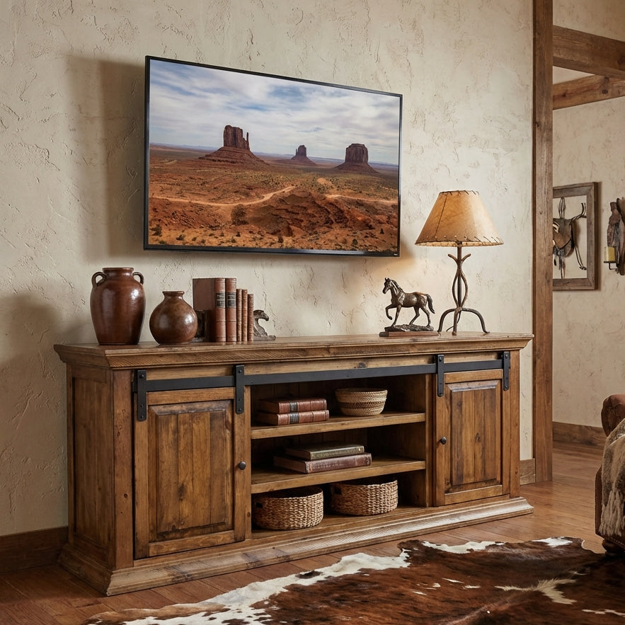 Accommodate your largest displays with the Longhorn 75" TV Stand. This sturdy piece features a spacious surface designed to support large televisions while offering ample storage below for media components, gaming consoles, and streaming devices. The rustic aesthetic complements any décor, blending timeless charm with functional design. Built to last, the Longhorn delivers the stability and style your home deserves.