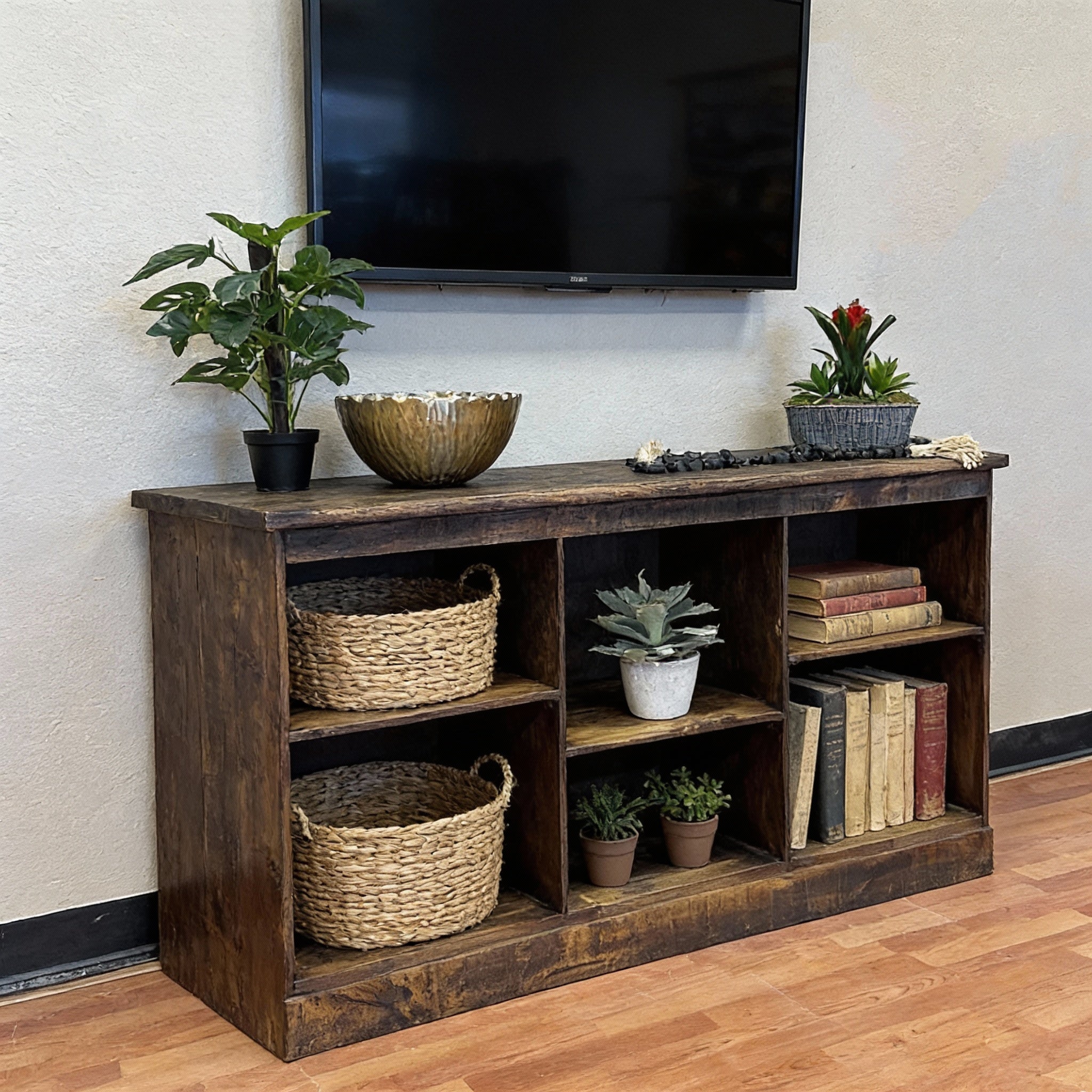 The Nevada 60" Console is a perfect addition to any rustic style living room. With its open shelf storage, you can easily display and store your items such as Baskets, Books, Electronics, and Decor while maintaining a clean and clutter-free space. Bring functionality and style to your home with this console.
