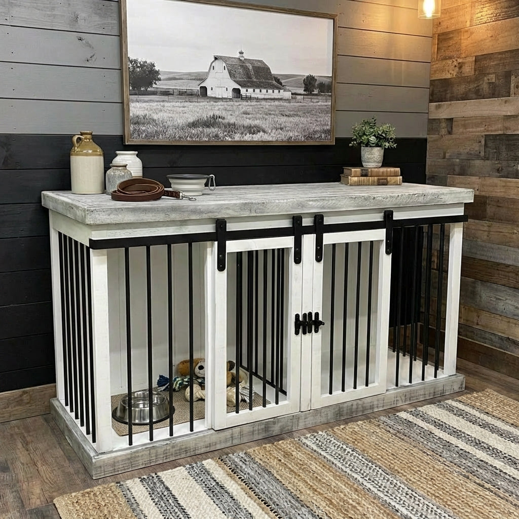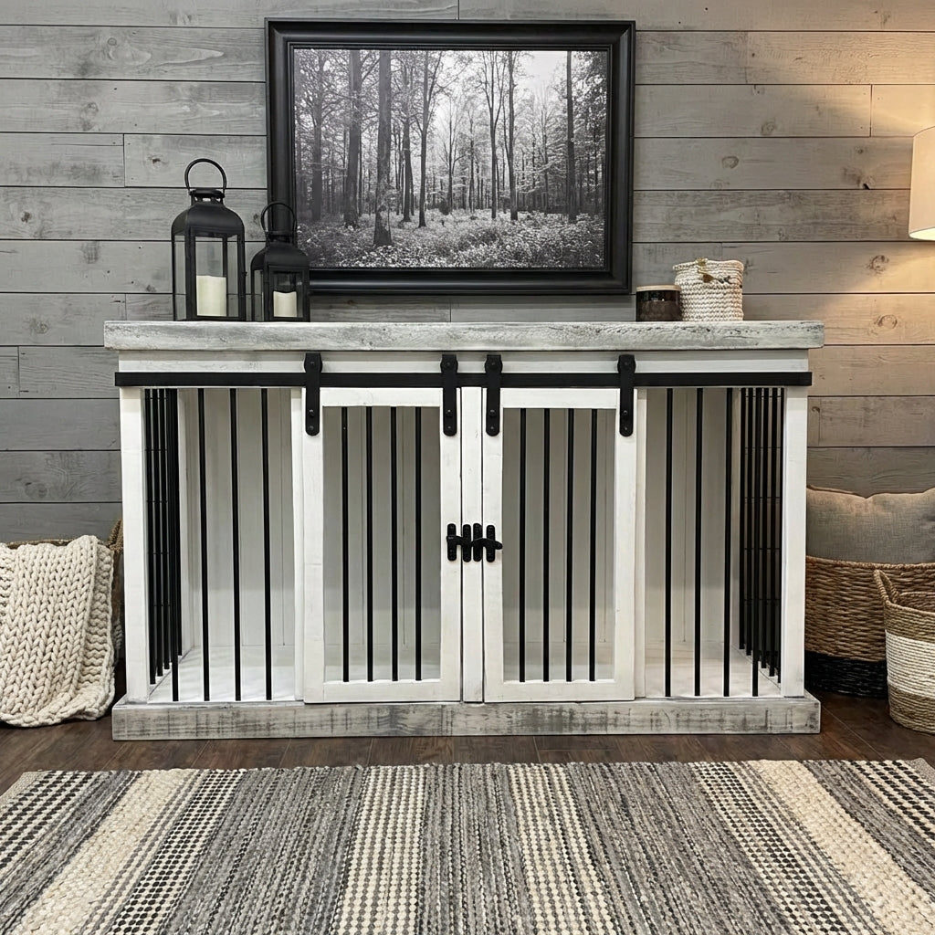 The Providence Dog Crate matches our Suburban Farmhouse Collection with a lightly hand scraped white paint accented with a Smokey gray stain and paint combination that brings the natural woodgrain to life. The Crate is designed as a TV Stand but can be used as a stand alone house for the furry friend.