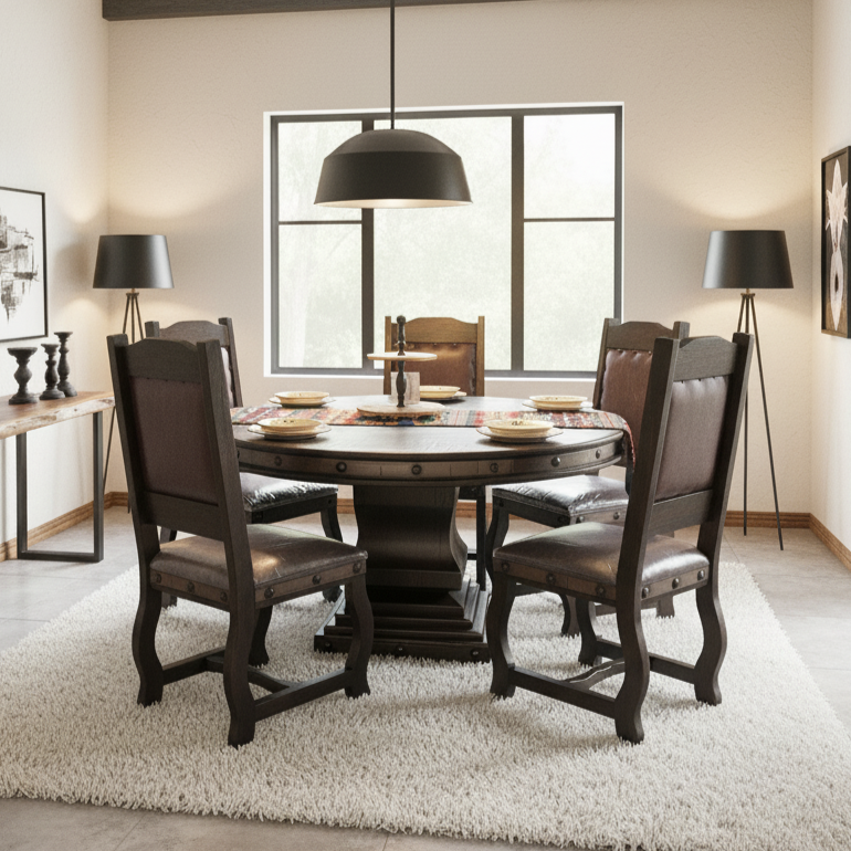 This 5' Pedestal Table set comfortably seats five. Part of our Santa Fe Collection, the Old West Finish is one of our most premium finishes with a deep rich dark walnut stain color with a lacquer sealer. A hand nailed metal band for the trim accent the table and chairs. The chairs come with leather padding and cushion.