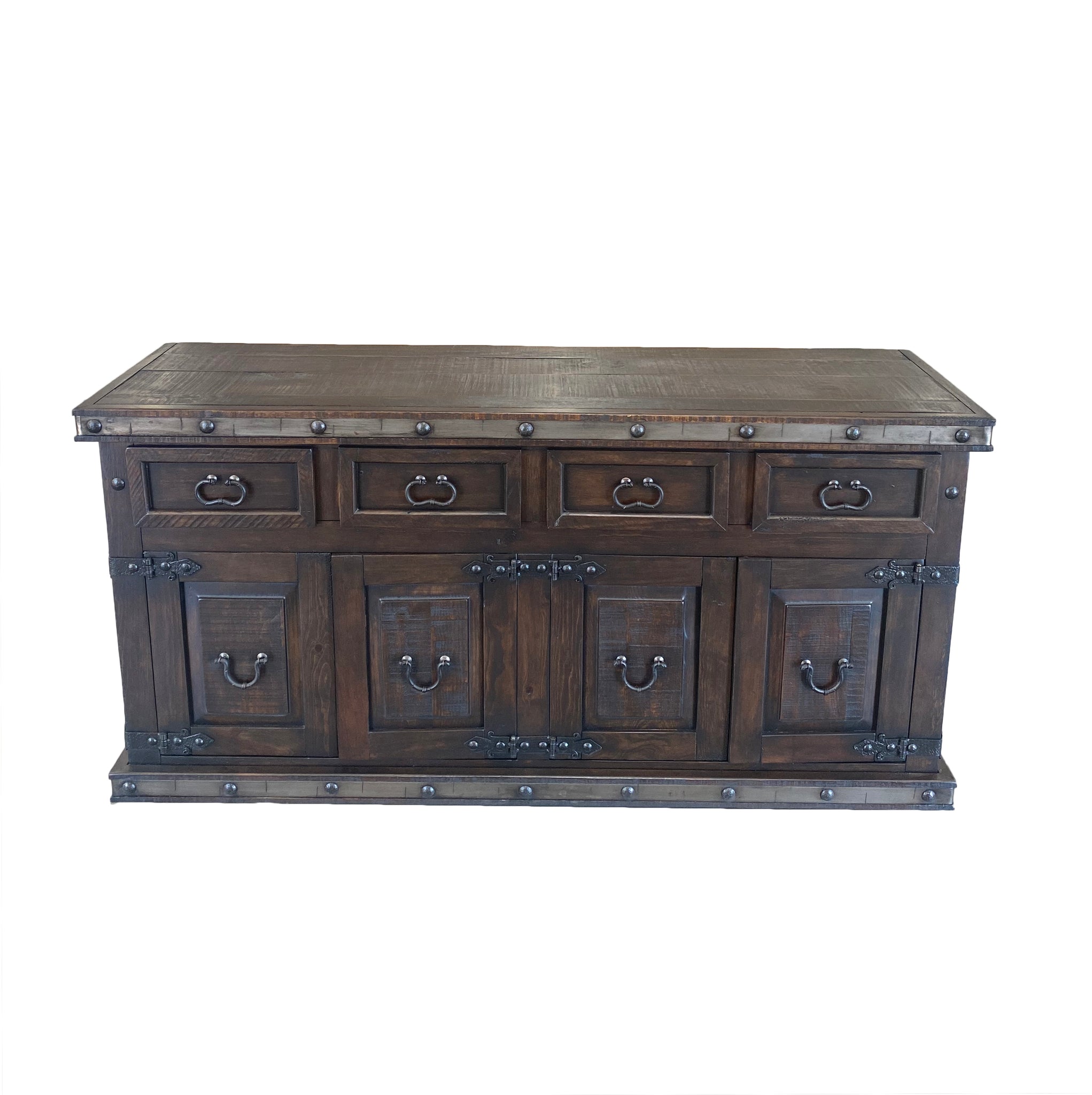 The Old Buffet is shown in our lush Old West stain with rich dark color depth. The 100% solid wood construction buffet comes with 4 doors, 4 drawers, solid metal hardware and 2 bands of nail head metal trim. This beautiful buffet will catch every eye in the house as a stand alone piece or use to complete the Old West Dining Set.