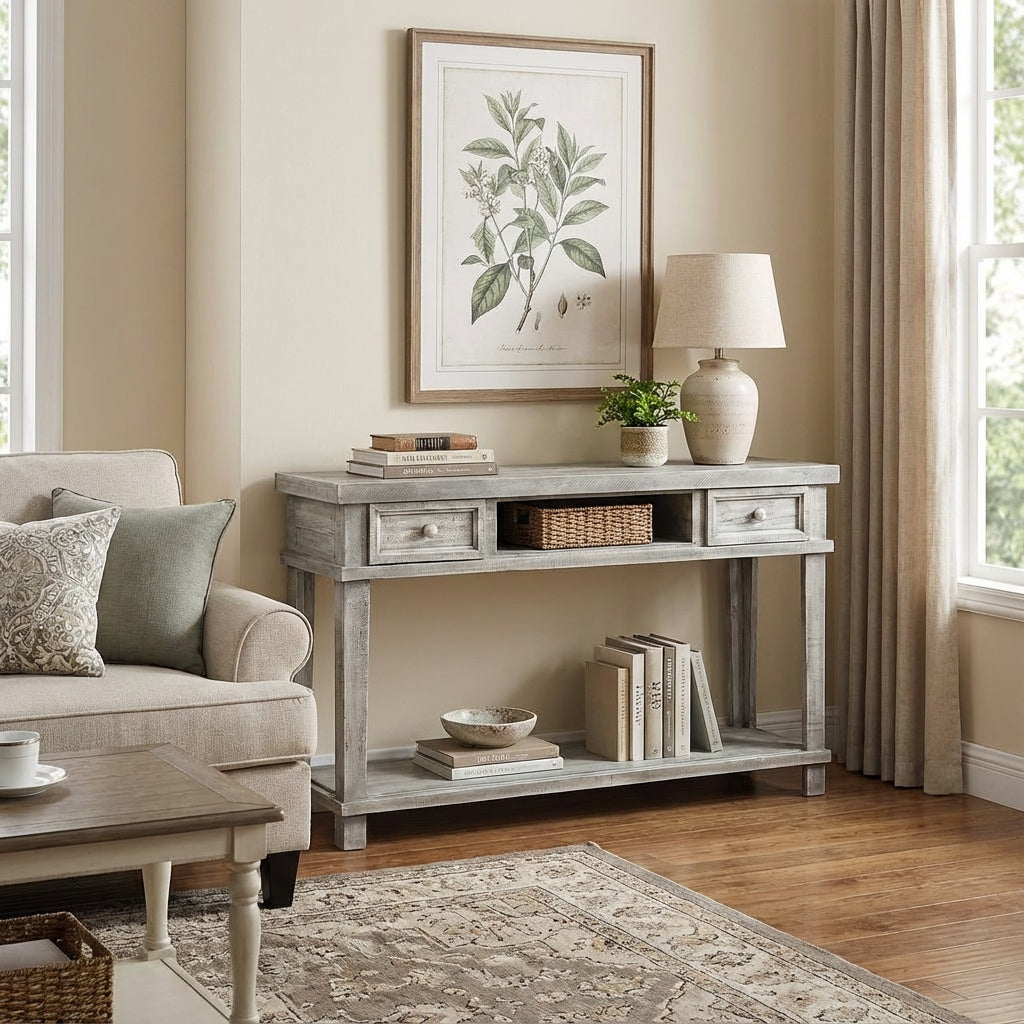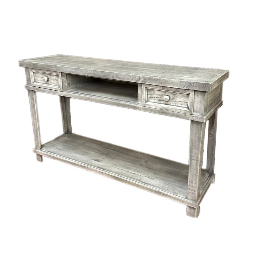 The Richmond Console is part of the Suburban Farmhouse Collection, and it features a smokey white and grey finish that complements any space. It's simple design makes it the perfect accent piece for any room.
