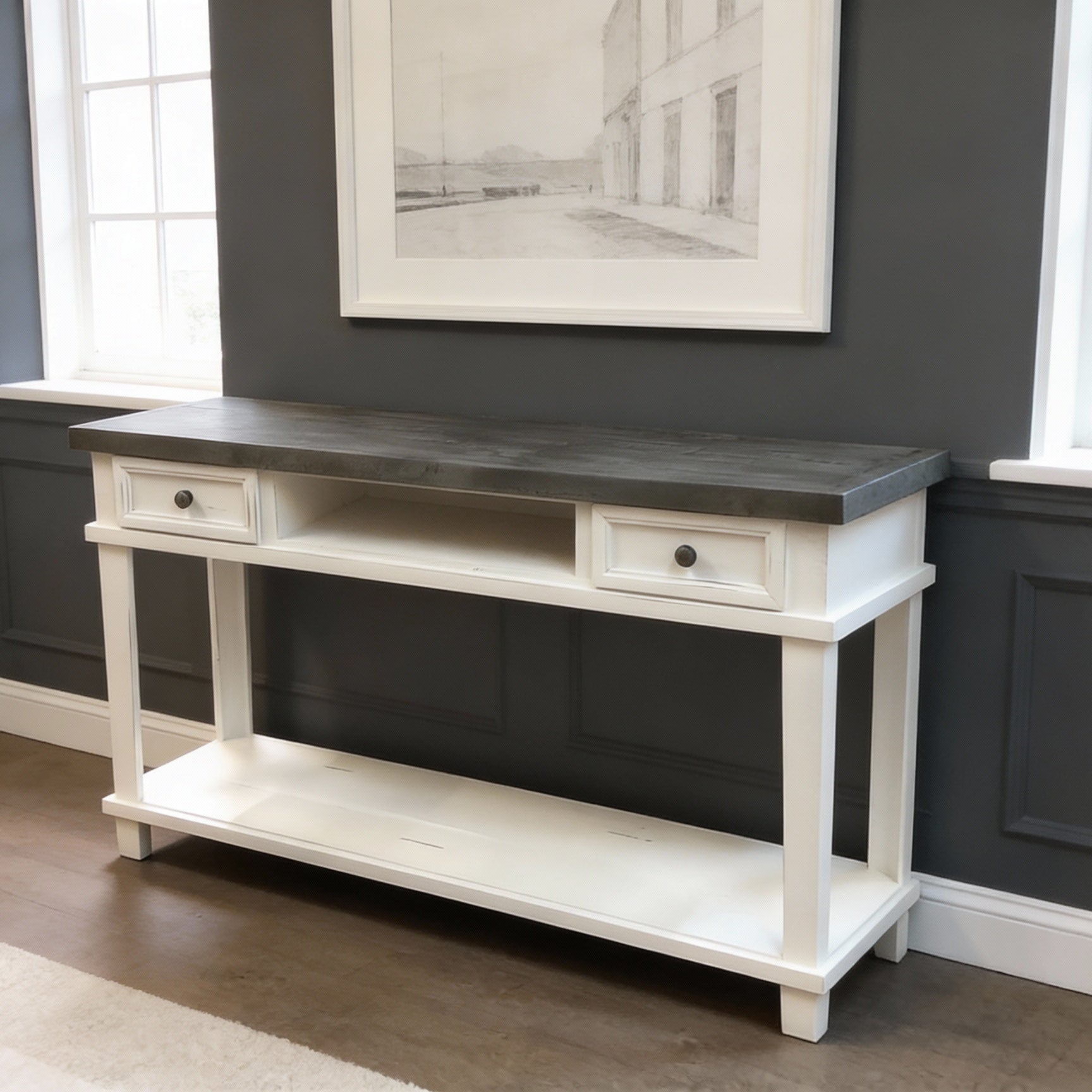 The Suburban Farmhouse Console is the perfect piece for any home, whether as the centerpiece or an accent. This console features our two tone Suburban Farmhouse finish at an amazing price. Whether you use it as an entry way piece, sofa table, console, or tv stand, this console is sure to make a statement.